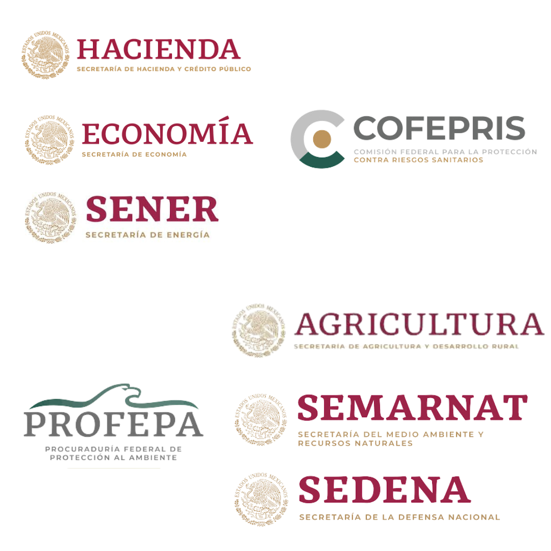 Las dependencias con las que trabaja incluyen Hacienda, Secretaría de Economía, Secretaría de Energía, Secretaría de Agricultura (SADER), Secretaría de Medio Ambiente (SEMARNAT), Secretaría de la Defensa Nacional (SEDENA), Profepa, Cofepris.